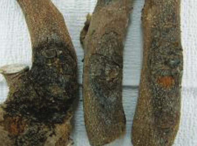 ◦ 감염된 줄기 부위가 약간 잘록하게 되고 진전되면 병자각이 형성되며, 성숙된 병자각이 수분을 흡수하면 팽압의 상승으로 암갈색 병포자가 줄기 표면으로 누출되어 병징을 나타냄