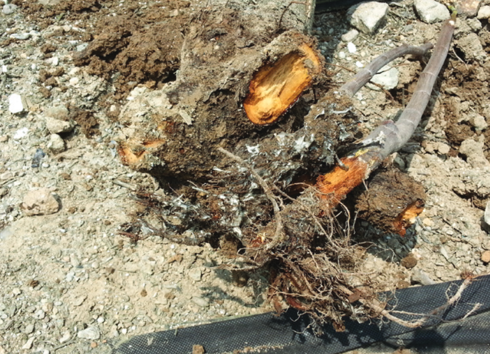 ◦ 주로 ‘봉래시’에서 발생되며, 비온 후 시들음 증상이 나타나기를 반복하고 이후에 고사하며, 나무를 뽑아보면 뿌리에 흰색의 곰팡이가 번져 있음