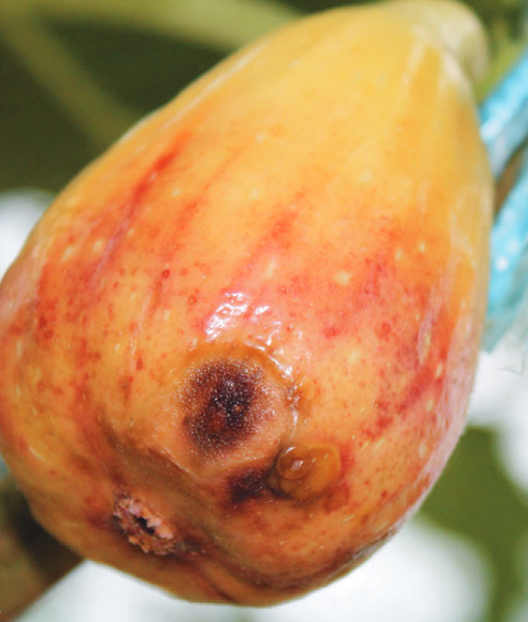 ◦ 과일에서은 초기에 작은 점무늬가 생기고 병반이 확대되면서 병반 부위가 원형, 수침상으로 변하여 움푹 들어가고 시간이 지나면 병반부는 검게 변하고 검은색의 병반 위에 연분홍색의 분생포자 덩어리를 가진 분생포자층을 형성하며, 습한 상태에서는 연한 황색의 포자 덩어리가 밀생함