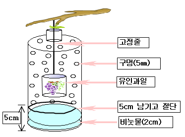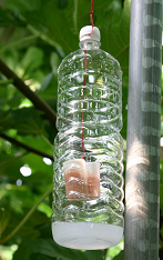 ※ 간이유살트랩 : 페트병에 5mm 정도의 구멍을 뚫고 잘 익은 무화과, 참다래, 토마토 등 유인용 과일을 매달고 밑에 비눗물을 부어 놓으며, 설치한 후 5~10일이 지나면 과일이 부패하여 유인효과가 떨어지므로 유인용 과일은 땅에 묻어 폐기하고 신선한 과일과 비눗물로 교환함