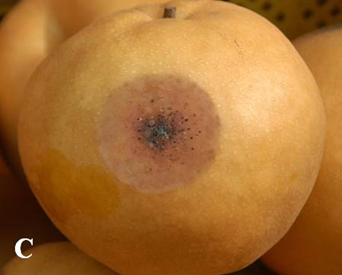 ◦ 봉지씌우기를 하지 않은 과실에서 숙과에 발생하는데, 처음에는 갈색의 원형반점이 생기고 진전되면 윤문상으로 나타나며, 심하면 병반부가 함몰되고 습하면 담홍색의 점질물(포자퇴)이 형성됨
