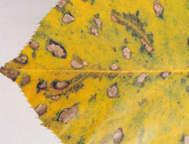 ◦ 잎에는 처음 적색 내지 갈색의 소형 병반이 형성되고 점차 진전되면서 2~3mm의 회백색 병반으로 윤문이 생기기도 하며, 그 표면에 흑색의 소반점(분생자층)이 다수 형성됨