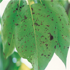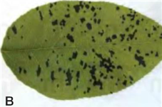 ◦ 가지별로 아랫잎으로 갈수록 병반이 많고 윗잎으로 갈수록 병반이 적거나 없으며, 일단 한번 발생한 나무에서는 매년 발생하고 정도가 심해짐