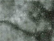 ◦ 병반의 직경은 1~3mm인데, 병반이 합쳐져 부정형 병반이 되기도 하나 더 이상 커지지는 않으며, 오래되면 병반이 회색으로 변하고 간혹 찢어져 지저분하게 됨