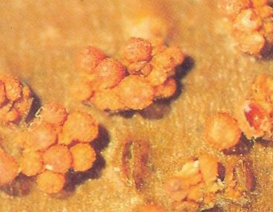 ◦ 오래된 병반상에는 홍색 내지 적갈색의 소립점(자좌)이 형성하는데, 마치 산호모양처럼 형성되므로 영명으로 Coral spot이라고 불리기도 함