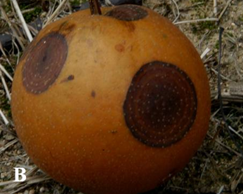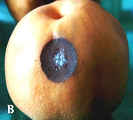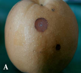 ◦ 주로 저장 중인 과실에 발생하며, 초기에는 2~3mm의 작은 연한 갈색반점이 형성되고 점차 확대되면서 표면이 다소 움푹 들어가 썩으며, 때로는 표면에 백색 균사를 형성함