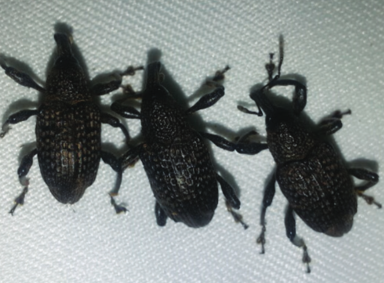 ◦ 성충의 몸길이는 15~35mm로 바구미류 중 가장 크며, 매우 통통한 편이고 긴 타원형으로 몸의 바탕색은 검지만 회갈색 또는 회황색의 미세한 비늘가루로 덮여 있음