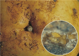 ◦ 약충과 성충이 과실 표면을 가해하면 과면이 마치 콩가루를 뿌린 듯 하고 그 부분에 균열이 생기고 검은무늬병균이 침입하여 검은색으로 변하며, 더 심해지면 과실이 거북 등같이 찢어지고 낙과