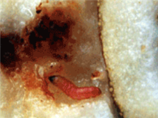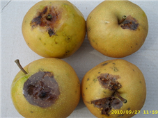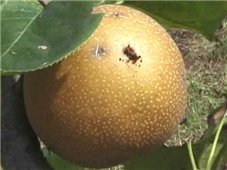 ◦ 과실의 피해는 7월 이후에 발생하는 3~4세대 유충이 과경을 통하여 과실 속으로 들어가 과피 바로 아래의 과육을 식해하여 피해 부분은 까맣게 변색되고 겉으로 똥을 배출하는 점에서 복숭아심식나방과 쉽게 구별