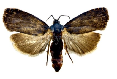 ◦ 성충은 길이가 5~7mm로 전체적으로 흑갈색을 띠며, 앞날개는 흑갈색이고 앞날개 바깥쪽으로 7개의 하얀 선이 있고 뒷날개는 암갈색이며 배는 암회색