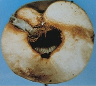 ◦ 유충이 발아기에 눈을 갉아 먹고 과실을 가해한 경우 큰 구멍을 내고 과심부까지 식해