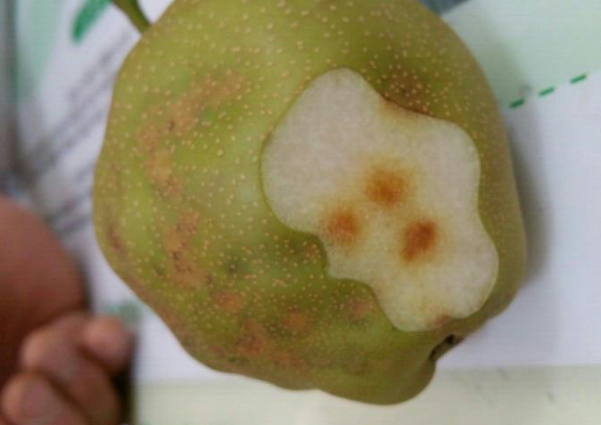 ◦ 노린재류 피해 증상은 과실 윗부분이나 옆면에 주로 나타나며, 피해부에 구침으로 찌른 흔적을 찾을 수 있는데, 초기에는 만곡 및 상처 흔적, 후기에는 만곡 및 조직의 경화로 나타남