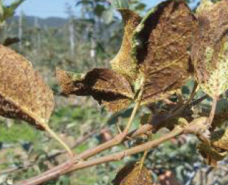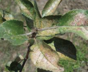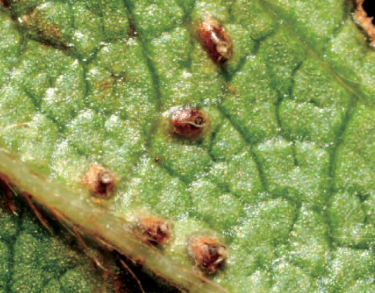 ◦ 주로 무농약 재배 과원에서 발생하며, 성충과 약충이 잎 뒷면에서 집단으로 가해하여 잎 앞면이 탈색되고 잎 뒷면에는 배설물과 탈피각이 붙어 있어 지저분해지고 그을음이 발생함