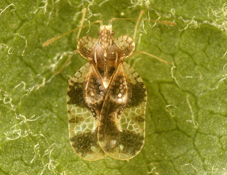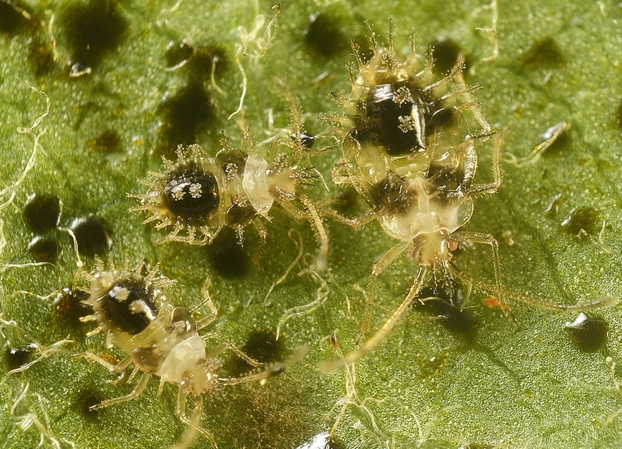 ◦ 약충은 몸길이가 약 0.4mm로 유백색이며, 흑색 무늬와 사마귀 모양 돌기가 있음