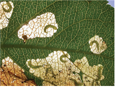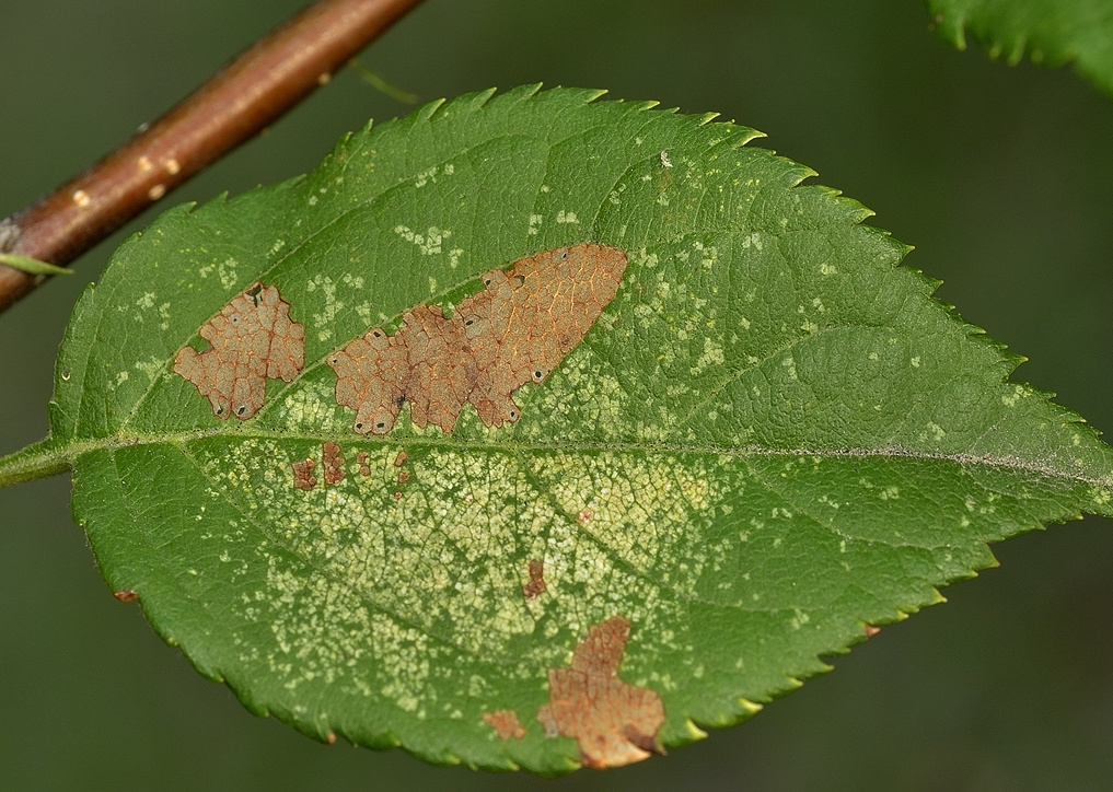 ◦ 5월 상순~중순에 잎의 주맥 또는 제1지맥을 따라 조직 내에 15~30개씩 무리지어 산란하고 그 위를 암갈색 분비물로 덮어 놓으며, 여름에는 각 충태가 동시에 나타남