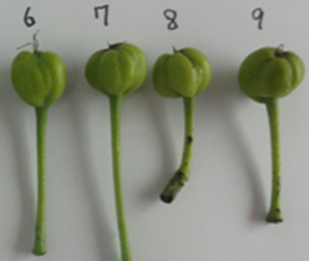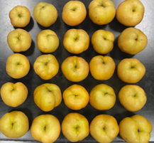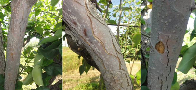 ◦ 어린 과실의 모양은 골이 지고 꽃받침 부착부위가 굴곡이 심한 기형과 발생이 많고 피해를 받았던 가지의 수피 부분은 수확기에도 회복되지 않고 갈변된 상태로 지속되며, 2년생의 약한 가지들은 일부 고사되고 굵은 가지들은 균열이 관찰되기도 함