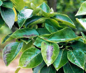 ◦ 주로 과총엽의 선단부 또는 잎의 한쪽이 흑갈색을 괴사하거나 심해지면 엽자루만 남고 엽조직이 흑색으로 말라 죽으며 조기낙엽 됨