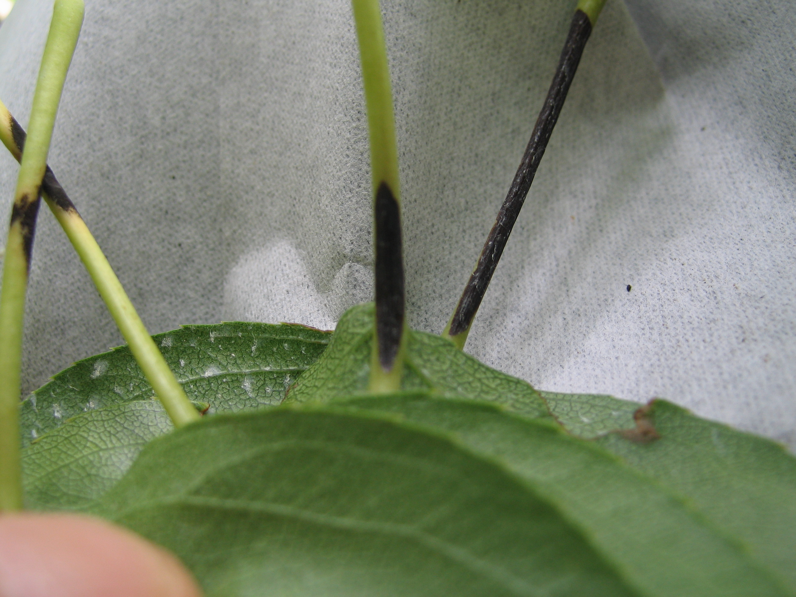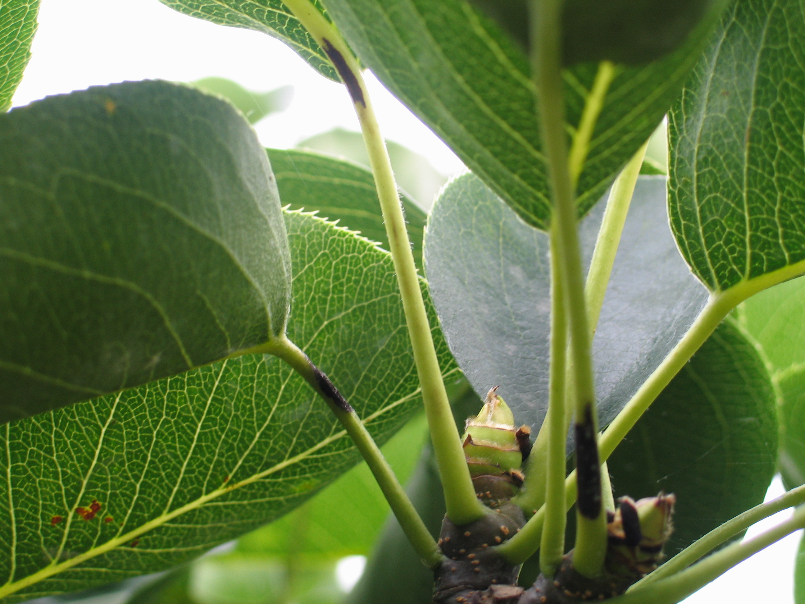 ◦ 주로 신고 품종에서만 발생하며, 과총엽의 상부엽 잎자루가 3~30mm까지 갈변되고 간혹 신초 하단부 잎에서도 발생하고 갈변된 잎자루는 흑성병과 같이 낙엽되나 번지는 현상은 없음