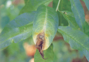 ◦ 잎에는 처음 잎끝부분부터 발생하기 시작하여 잎 중앙으로 확대되는데 특히 상처가 있거나 다른 병의 병반 부위에 복합감염되어 발병되는 수도 있음