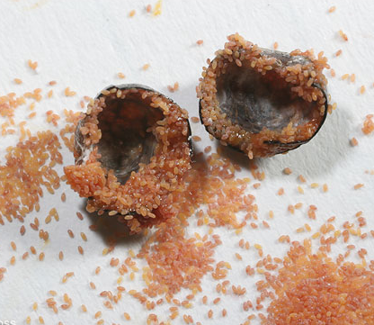 ◦ 암컷 성충은 깍지는 4~5mm이고 둥근형의 갈색~농갈색이며 광택이 있고 피부에는 작은 가로 무늬가 있으며 등면은 경화되어 있음