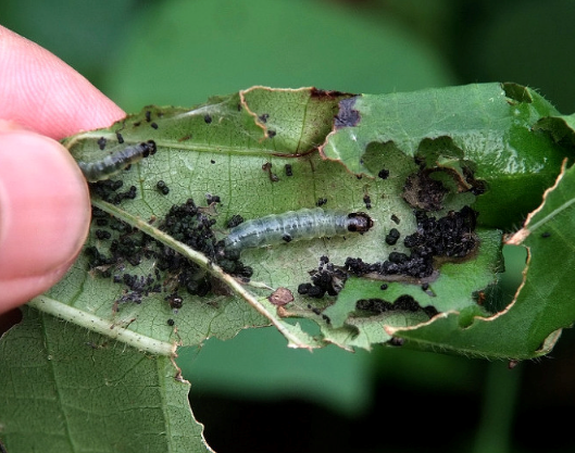 ◦ 여름세대는 새가지 선단부 잎을 뚫거나 세로로 말고 식해하며, 과실에 잎을 붙여 과실의 표면을 핥듯이 점점 가해함