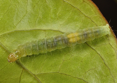 ◦ 유충은 길이가 17mm 정도이고 몸은 황록색으로 홑눈과 뺨에 흑갈색의 얼룩무늬가 있음