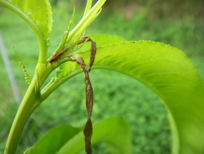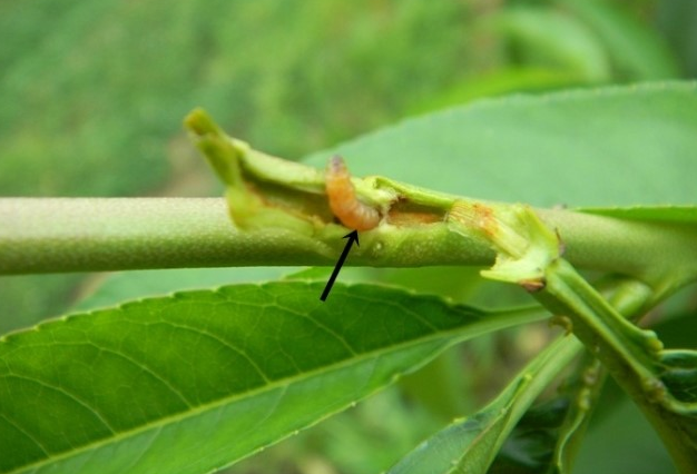 ◦ 유충이 신초 선단부를 먹어 들어가 신초가 꺾여 말라 죽으며, 진과 똥을 배출하므로 쉽게 발견 할 수 있음