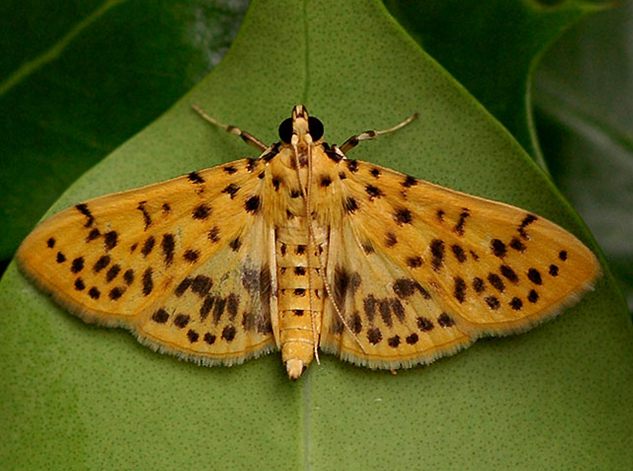 ◦ 성충은 몸길이가 15mm, 날개 편길이 25~30mm, 가슴과 배에 흑색의 반점이 있고 앞날개에는 20개, 뒷날개에는 10개 정도의 흑색점이 있음