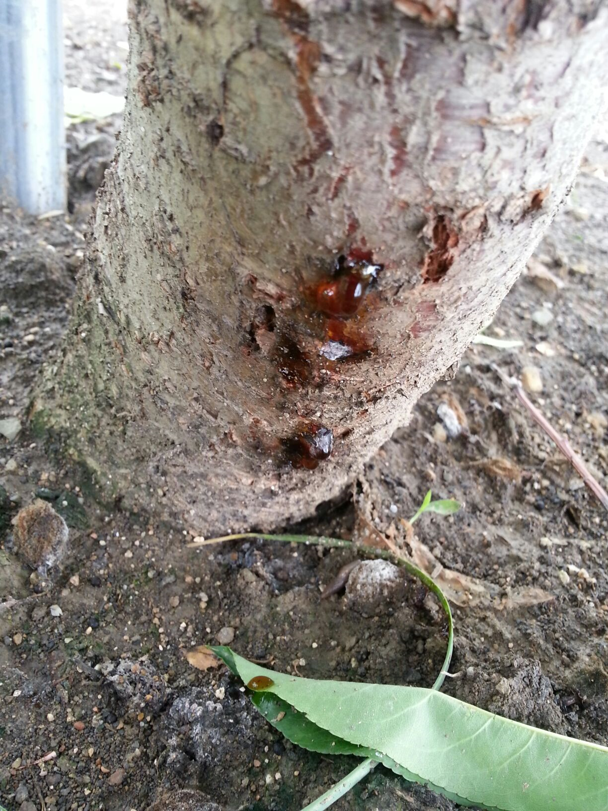 ◦ 원줄기나 원가지에서 수지가 분비되는 것으로 처음에는 투명한 젤리모양의 수지가 분비되어 차츰 진한 갈색으로 되고 나중에는 굳어져 흑갈색으로 됨