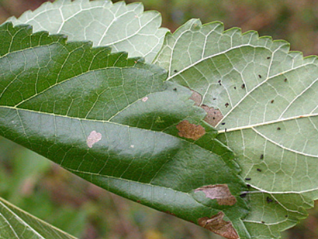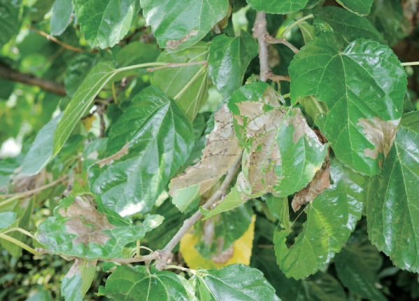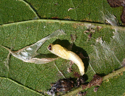 ◦ 봄부터 가을까지 유충이 잎 1장 또는 여러 장을 묶고 그 속에서 잎을 갉아 먹으며, 주로 햇빛이 많이 비치는 나무에 피해가 많음
