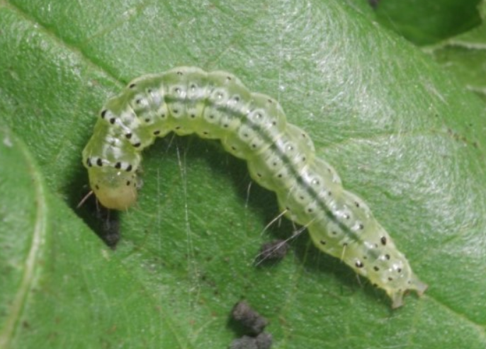 ◦ 어린 유충은 연두색이며, 노숙유충은 몸길이가 약 18mm로 머리는 황갈색이고 몸은 바탕이 회녹색이며, 검은 점무늬가 있음