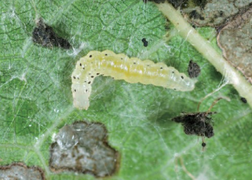 ◦ 유충은 잎 뒷면부터 잎맥이나 표피를 남기고 잎살(엽육)을 갉아먹기 때문에 피해 잎은 갈변하고 바람에 의해 찢어져 구멍이 뚫리기도 함