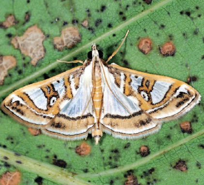 ◦ 성충은 날개편길이 20~23mm이고 몸은 황갈색이며, 앞날개와 뒷날개 바탕은 흰색이고 황갈색 무늬가 있음