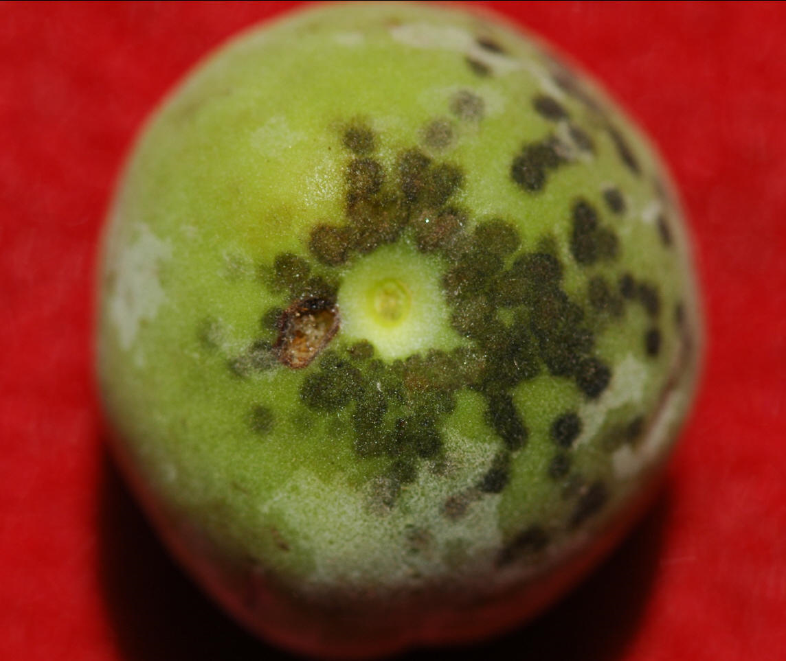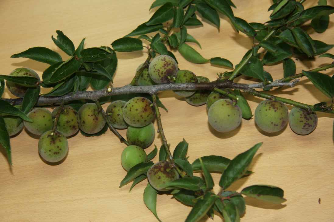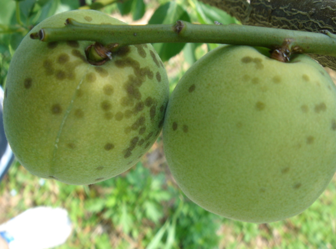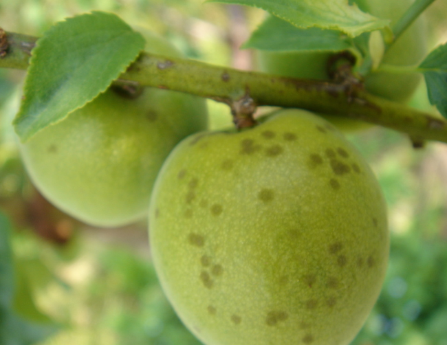 ◦ 과실 표면에는 처음에 약 3mm정도의 흑색반점이 생기고 증상이 세균성구멍병과 흡사하나 검은별무늬병으니 과실표면에만 나타나고 병반이 갈라지지 않는 것이 세균성구멍병과 구별됨