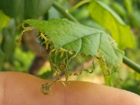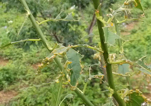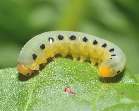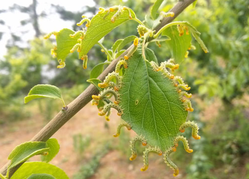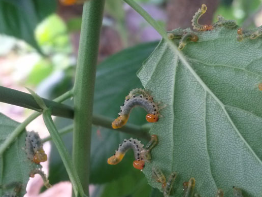 ◦ 유충이 7월에 무리지어 잎을 갉아 먹으며, 피해가 심하면 잎을 다 먹어치워 가지만 남음