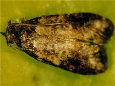 ◦ 성충은 몸길이가 7~8mm, 날개 편길이 12~15mm, 앞날개는 회황색 또는 암갈색이고 앞 가장자리에 구름모양의 남흑갈색 무늬와 중앙보다 약간 아래에 광택나는 삼각형 무늬가 있음