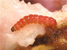 ◦ 유충은 몸통 가운데가 볼록한 편이며, 과실 속에 있을 때는 황백색이나 자라서 탈출할 때는 빨간색이 많아짐