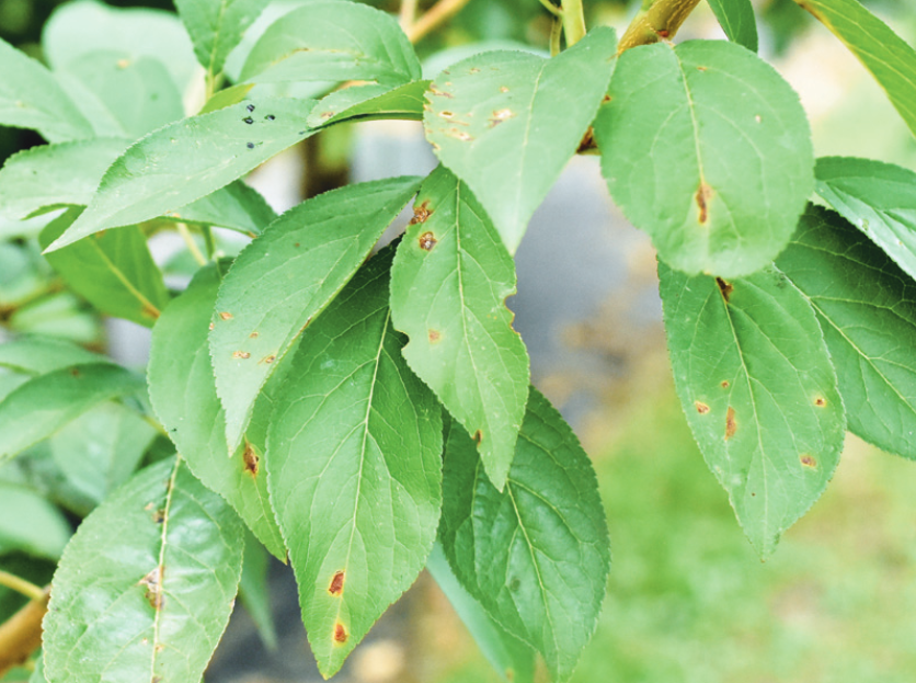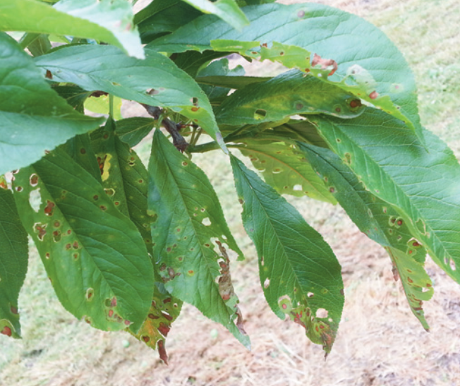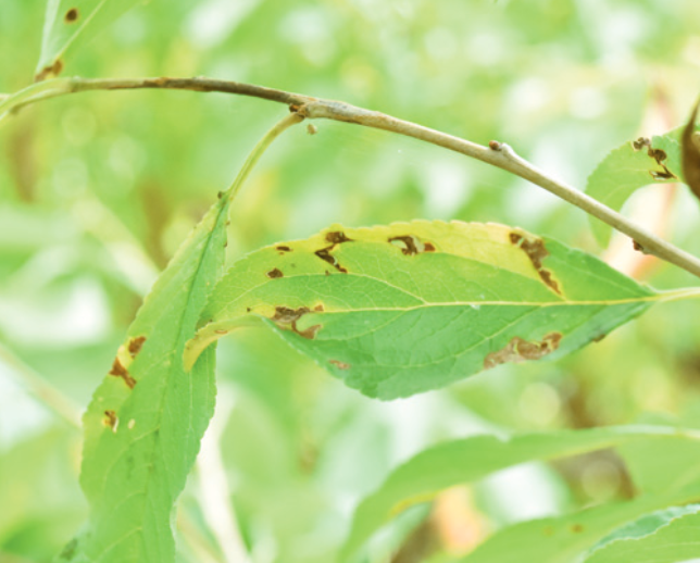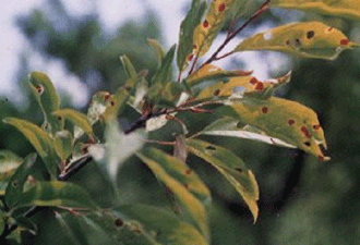 ◦ 초기의 병징은 잎에 작은 수치상으로 나타나고 점차 적갈색 내지 자갈색으로 변하여 부정형으로 확대되며, 그 후 흑갈색으로 변한 후 병반부가 떨어져 나와 구멍이 생기고 잎이 조기낙엽 됨