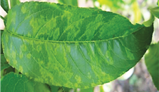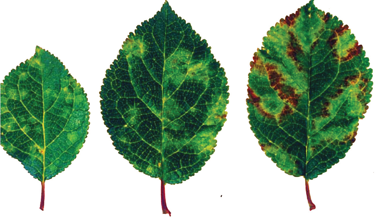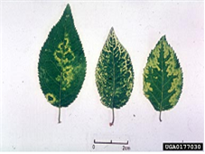 ◦ 봄에 잎에서 아주 분명하며, 괴사반점, 윤문, 엽맥 퇴화 또는 잎 기형의 병징이 나타남