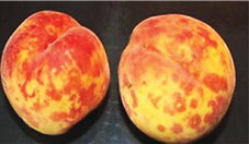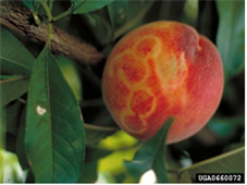 ◦ 감염된 과실에서는 괴사반점이나 윤문이 생기며, 성숙 전 낙과량이 많아 수량이 상당히 감소되는 영향