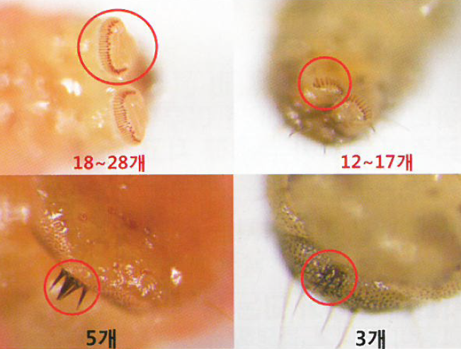 ※ 유충은 복부말단 발톱 개수(위) 및 가시털 수(아래)로 구별