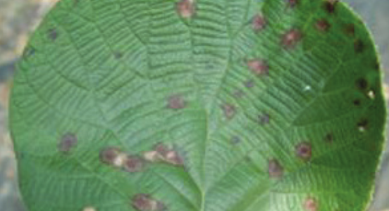◦ 잎에 주로 발생하며, 9~10월경 잎에 윤문 형태로 원형~부정형의 갈색 병반을 형성하고 진전될 경우 병반이 확대 융합되어 9월 하순경부터 낙엽이 되기도 함