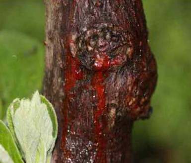 ◦ 병든 가지는 발아하지 않거나 발아해도 4~5월경에 신초는 위조, 고사하는 경우가 많으며, 생장 중의 신초가 감염되면 선단부는 수침상 흑색으로 쪼개져서 위조, 고사함