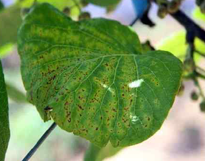 ◦ 잎에는 신초가 10~15cm 정도 신장하면 2~3mm의 부정형 갈색반점 주위에 뚜렷한 황색띠를 동반한 병반을 형성하고 4~5월의 습윤 시에는 황색띠를 동반하지 않는 대형의 급성형 병반을 형성하기도 하며, 4~6월이 발생 최성기이나 장마 후에는 발병하지 않음