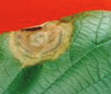 ◦ 수술이 다시 잎에 부착되면 담갈색의 윤문상 병반으로 확대되고 다습한 조건이 유지되면 잎에 육안으로 관찰이 가능한 회색의 분생포자를 형성함