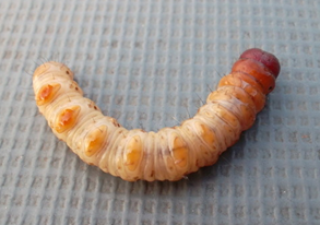 ◦ 유충은 머리가 갈색이고 몸은 유백색이며, 몸 마디마디에 갈색의 작은 점무늬가 널려져 있음