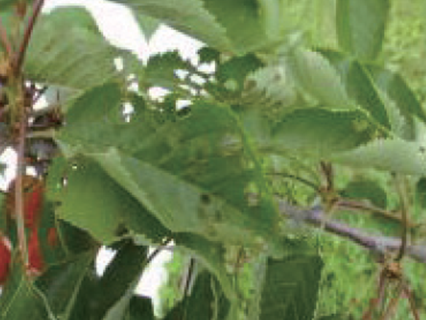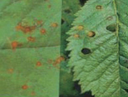 ◦ 잎에 초기에는 수침상의 작은 반점으로 나타나고 점차 부정형의 적갈색 반점으로 확대되며, 오래되면 병반부가 떨어져 나가 구멍이 생기고 병든 잎은 조기에 낙엽됨