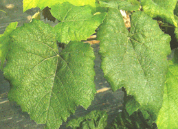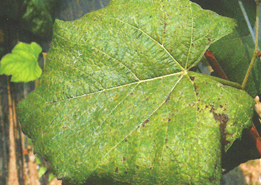 ◦ 포도에서의 발병은 6월 하순경부터 하엽부터 시작되어 병반이 증가하면서 표면에 황색의 얼룩을 형성하고 후에 흑갈색으로 변하면서 낙엽됨