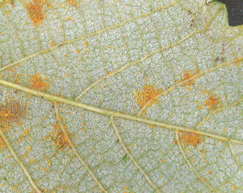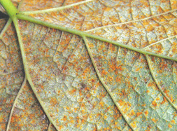 ◦ 7월경 잎의 표면에 황색의 작은 반점이 생기고 뒷면에는 등황색의 가루모양의 포자 덩어리가 생기며, 심해지면 잎이 흑갈색으로 변하여 낙엽됨