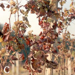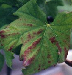 ◦ 잎 가장자리가 타는 듯이 괴사하며, 포도나무 전체가 붉은색이나 노란색을 띰